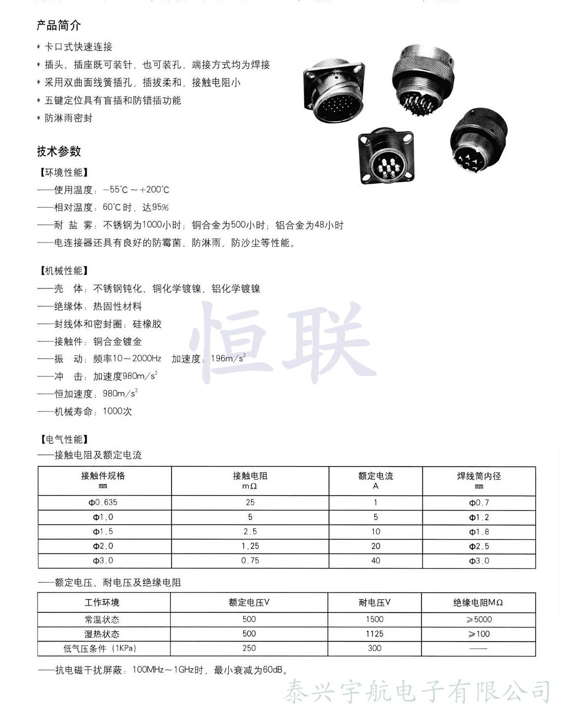 該系列電連接器采用卡口式快速連接和分離,操作方便、連接可靠、五鍵定位,具有盲插和防誤插功能,接觸件采用高可靠的雙曲面線簧插孔,具有插拔柔和、接觸電阻小的特點。該系列電連接器插頭插座均為壓接,廣泛應(yīng)用于潮濕、浸水等惡劣環(huán)境下的設(shè)備與電纜、電纜與電纜之間的電氣連接。